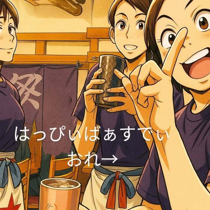 昨夜、一足早くお祝いして頂いたお客様から写真を頂き、せっかくなのでチャットGTPに同い年の漫画家さんの作風に加工してもらいました。